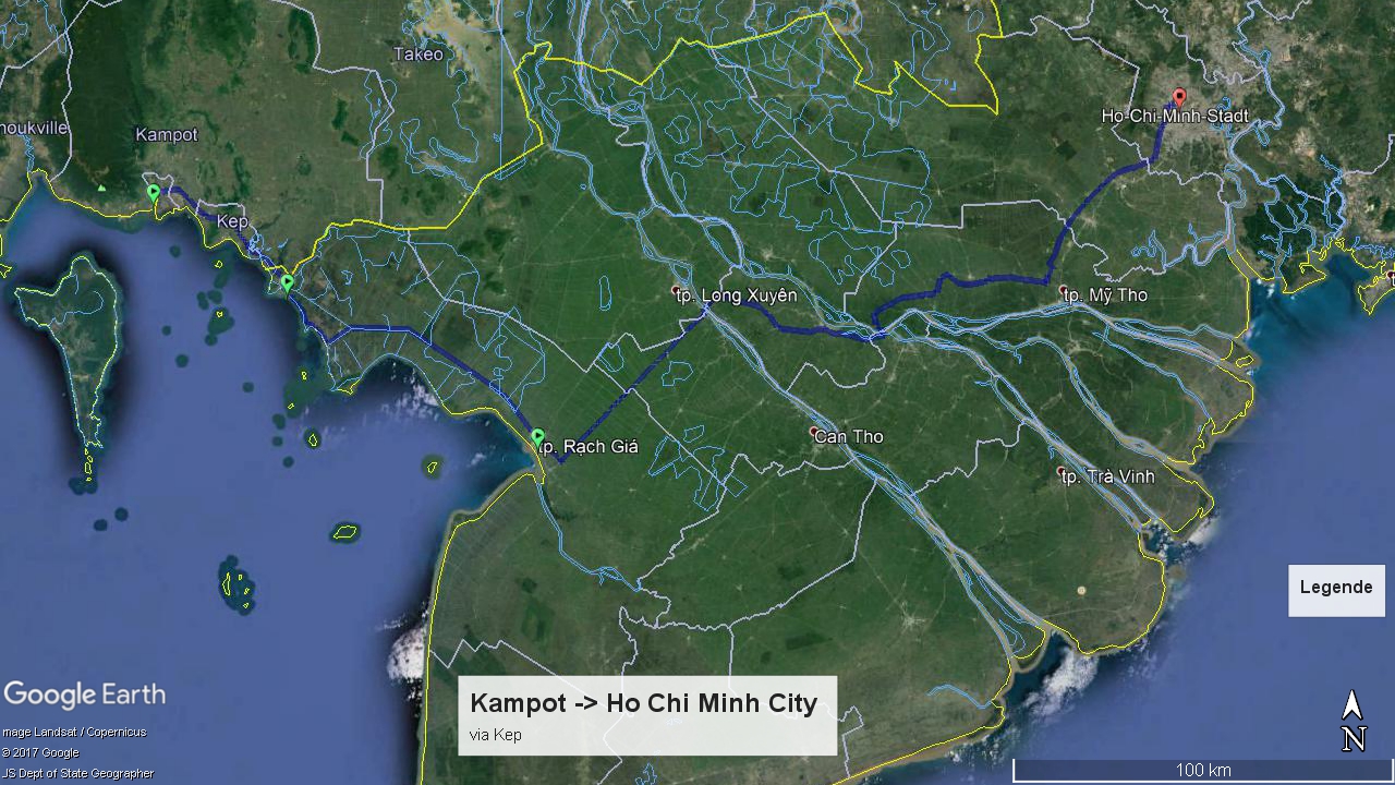 Von Kampot gings früh morgens mit einem Minibus ohne Klimaanlage über Kep der Küste entlang zur Grenze, wo wir so ziemlich die einzigen Menschen waren. Danach in einem großen Bus weiter zu einer Hafenstadt, wo allerhand Tourioffices abgeklappert wurden, um verlorene Touristen aufzulesen. An einem Busterminal angekommen, verkniff ich mir eine Klopause, da 2000 Dong gefragt waren, die ich noch nicht hatte. Der nächste Bus war eine super merkwürdige Konstruktion: 3 Reihen mit Sitzkojen. Wahnsinnig unbequem. Sogar mein Nachbar (ein Expat aus Frankreich der seit Jahren in HCMC wohnt und einen Kopf kürzer war als ich) fand das Platzangebot äussert beengend.